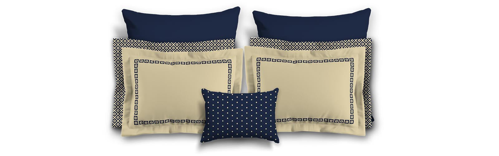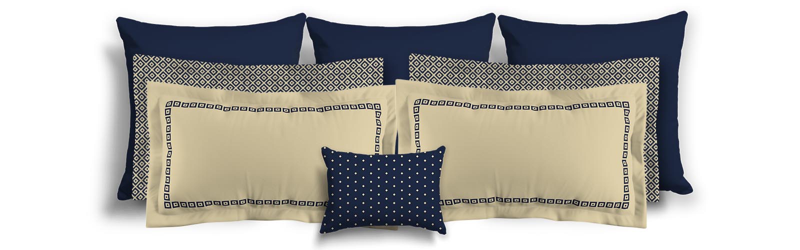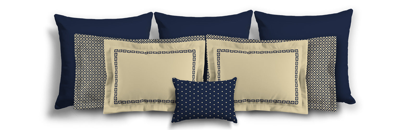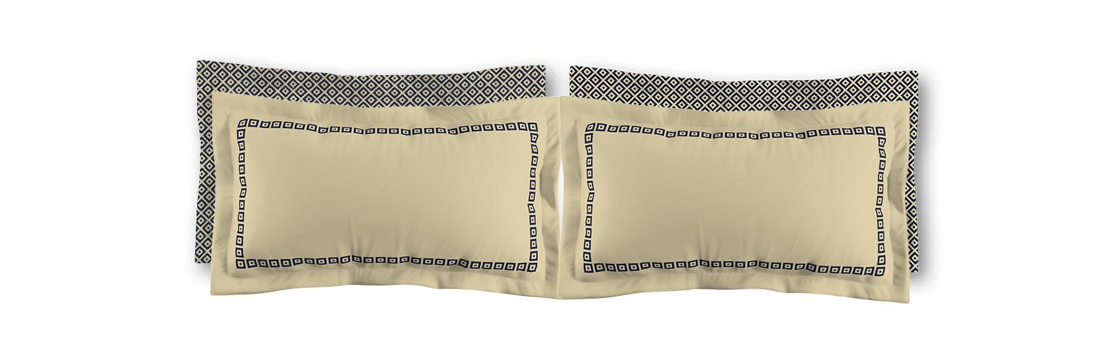 Tan Microfiber Pillow Sham with Flange, Navy Blue Repeating Square Motif Print, Classic Border, Tan Reverse Side | MFSF-1274-121