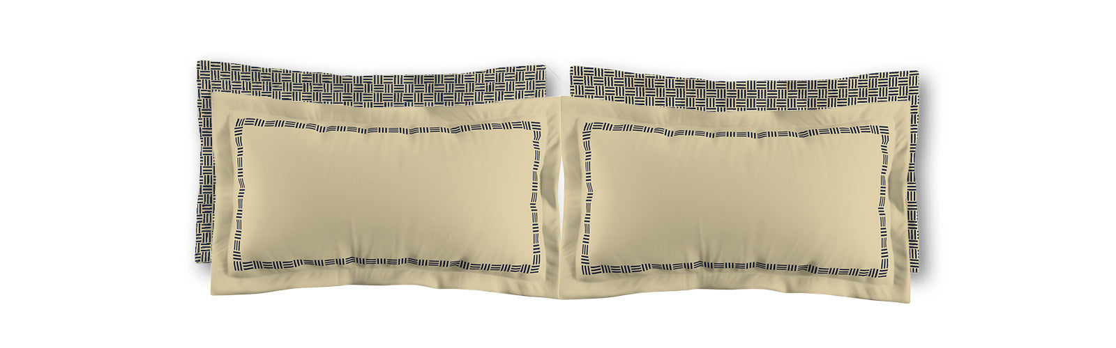 Tan Microfiber Pillow Sham with Flange, Navy Blue Single Weave Motif Print, Classic Border, Tan Reverse Side | MFSF-1274-141