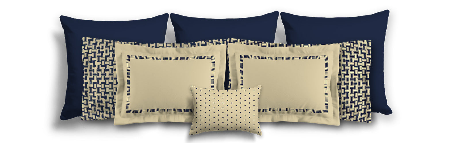 Tan Microfiber Pillow Sham with Flange, Navy Blue Single Weave Motif Print, Tan Reverse Side | MFSF-1274-142