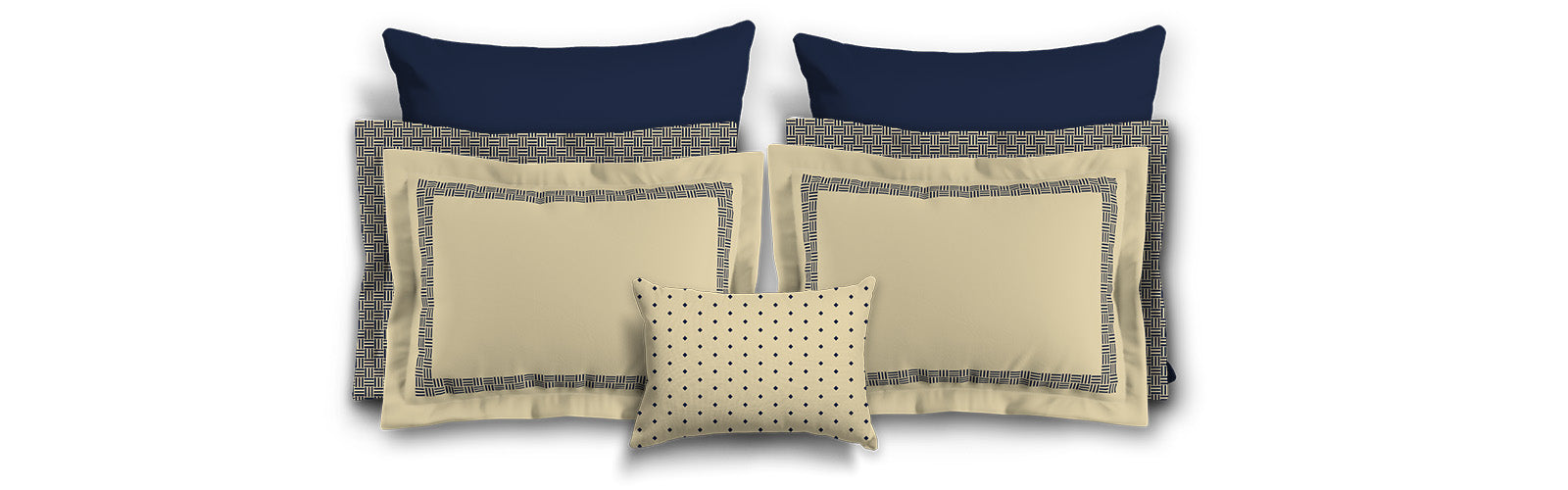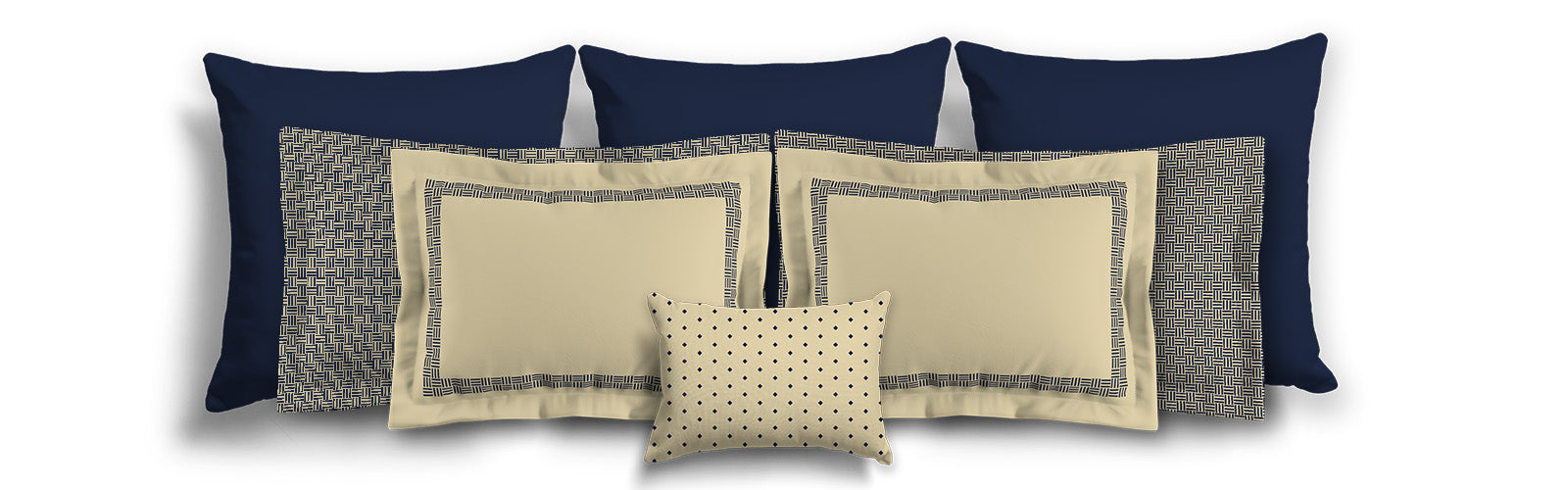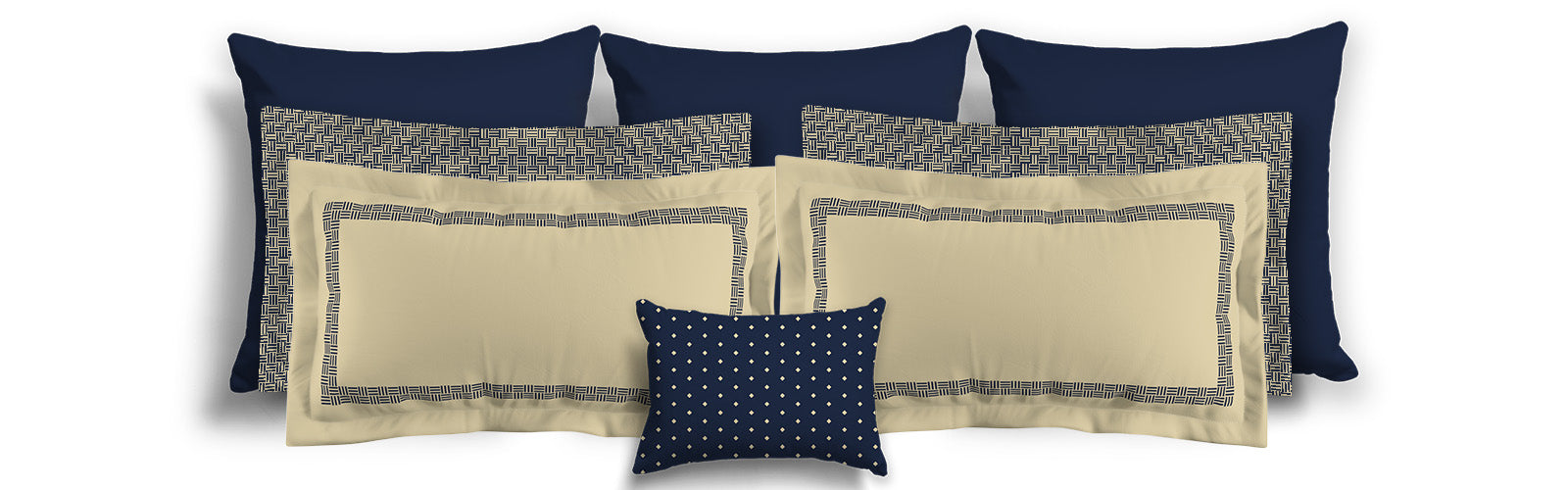 Tan Microfiber Pillow Sham with Flange, Navy Blue Double Weave Motif Print, Tan Reverse Side | MFSF-1274-144